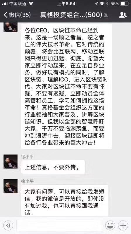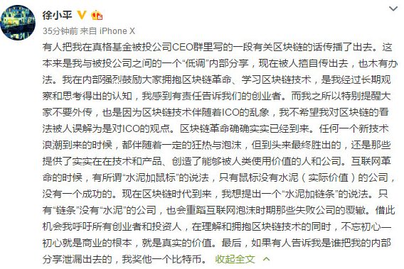 此截图流出后,舆论哗然。在该截图逐渐开端被外界过火解读之时,徐小平教师及时在个人微博上表明,该截图的确为自己在真格基金被投公司CEO群里写的一段有关区块链的话。不过,徐小平表明这是自己在内部的一个“低沉共享”,他自己的确也鼓舞我们拥抱区块链革新、学习区块链技能。一起,徐小平也在微博中提示要警觉ICO乱象以及职业泡沫。