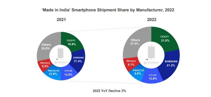 - 2022 年 OPPO 以 22% 的市占率在“印度制作”智智能手机出货量位居榜首,三星位居第二